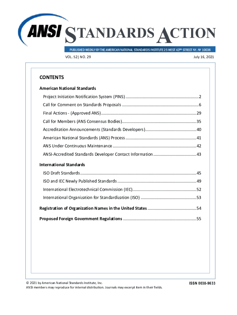PUBLISHED WEEKLY BY THE AMERICAN NATIONAL STANDARDS INSTITUTE 25 WEST 43RD STREET NY, NY 10036VOL. 52| NO. 29July 16, 2021CONTENTS American National Standards Project Initiation Notification System
