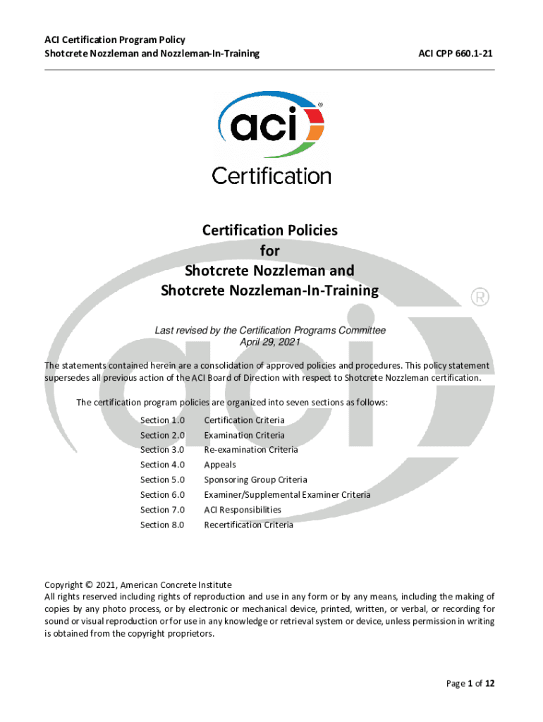 ACICertificationProgramPolicy ShotcreteNozzlemanandNozzlemanInTraining ACICPP660.121 CertificationPolicies for ShotcreteNozzlemanand ShotcreteNozzlemanInTraining Last revised by the Certification