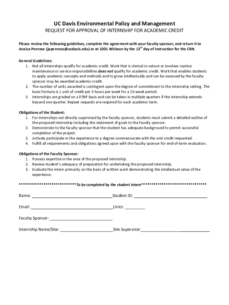 UC Davis Environmental Policy and ManagementREQUEST FOR APPROVAL OF INTERNSHIP FOR ACADEMIC CREDITPlease review the following guidelines, complete the agreement with your faculty sponsor, and return