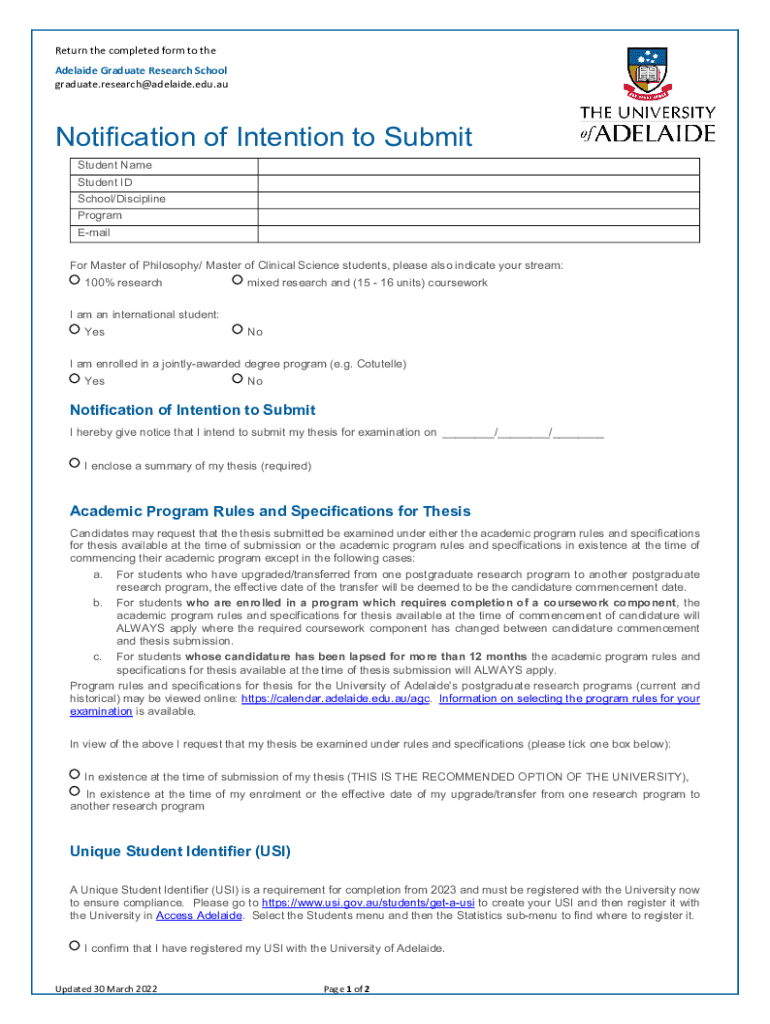 Get the free Notification of Intention to Submit - University of Adelaide