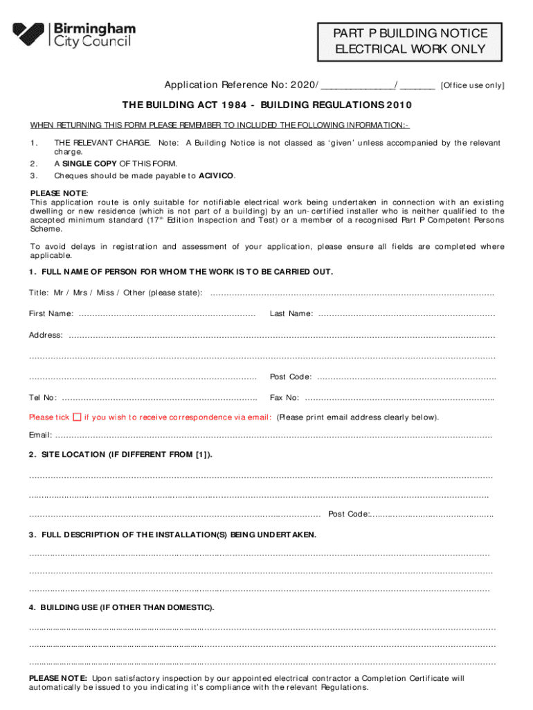 PART P BUILDING NOTICE ELECTRICAL WORK ONLY Application Reference No: 2020/___/___ [Office use only] THE BUILDING ACT 1984 BUILDING REGULATIONS 2010 WHEN RETURNING THIS FORM PLEASE REMEMBER TO Include