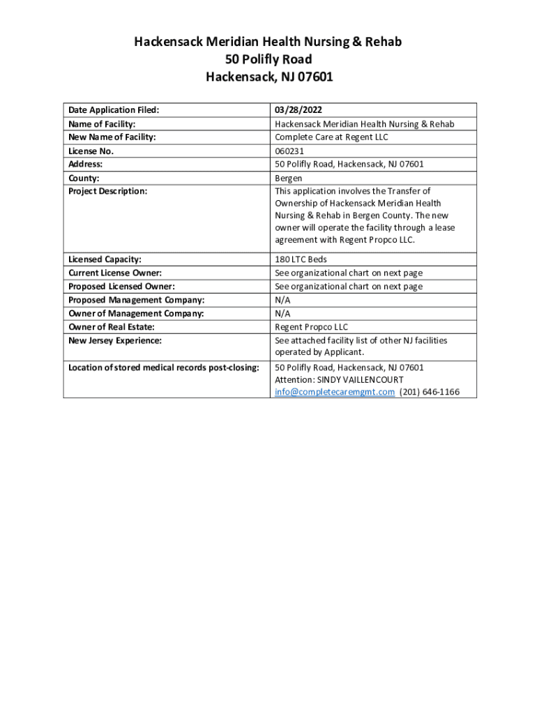 HackensackMeridianHealthNursing&Rehab 50PoliflyRoad Hackensack,NJ07601 DateApplicationFiled: NameofFacility: NewNameofFacility: License No. Address: County: ProjectDescription:03/28/2022 HackensackMeridianHealthNursing&Rehab