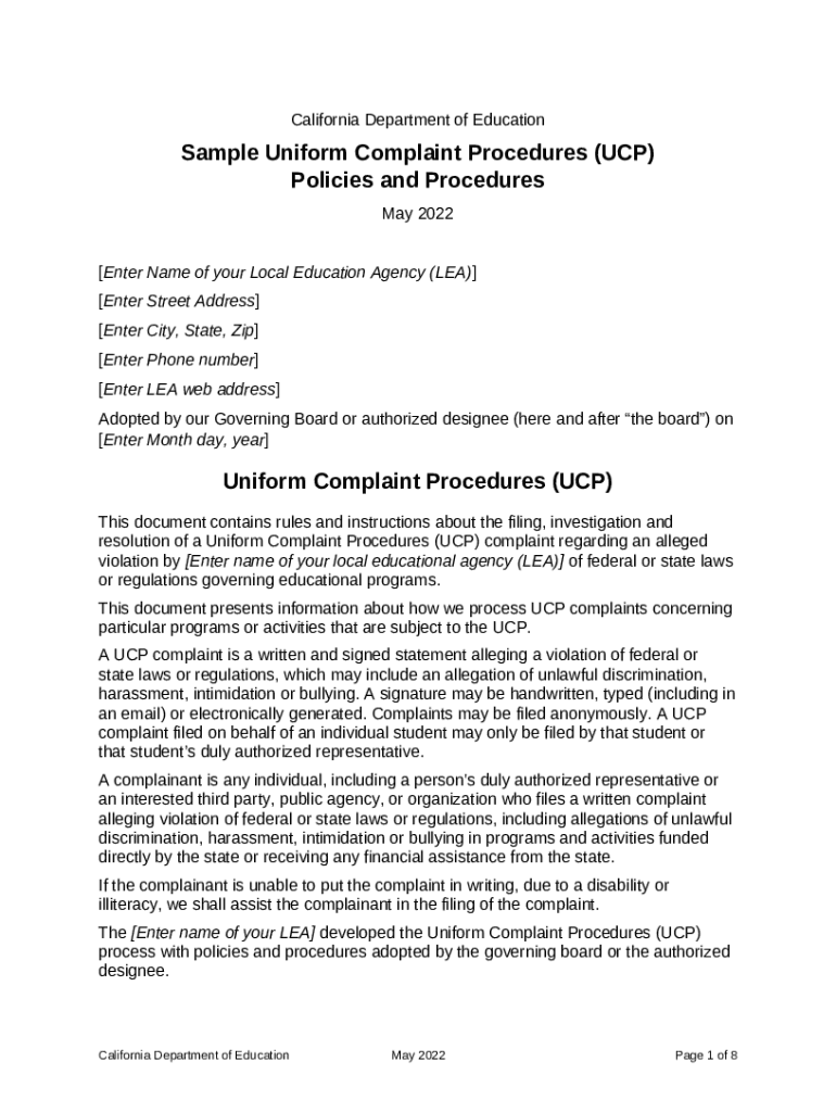 The www.cde.ca.gov re cpUni Complaint Procedures - Complaint Procedures (CA Dept ... is a document that can be filled-out and signed for specified purposes. Next, it is furnished to the relevant addressee in order to provide specific details and data. The completion and signing can be done or via an appropriate application e. g. PDFfiller. These applications help to submit any PDF or Word file without printing out. While doing that, you can edit its appearance for the needs you have and put legit electronic signature. Once you're good, you send the www.cde.ca.gov re cpUni Complaint Procedures - Complaint Procedures (CA Dept ... to the recipient or several ones by mail and also fax. PDFfiller includes a feature and options that make your Word form printable. It provides different settings when printing out appearance. It doesn't matter how you deliver a form after filling it out - in hard copy or electronically - it will always look professional and organized. To not to create a new editable template from the beginning again and again, turn the original Word file as a template. Later, you will have a customizable sample.