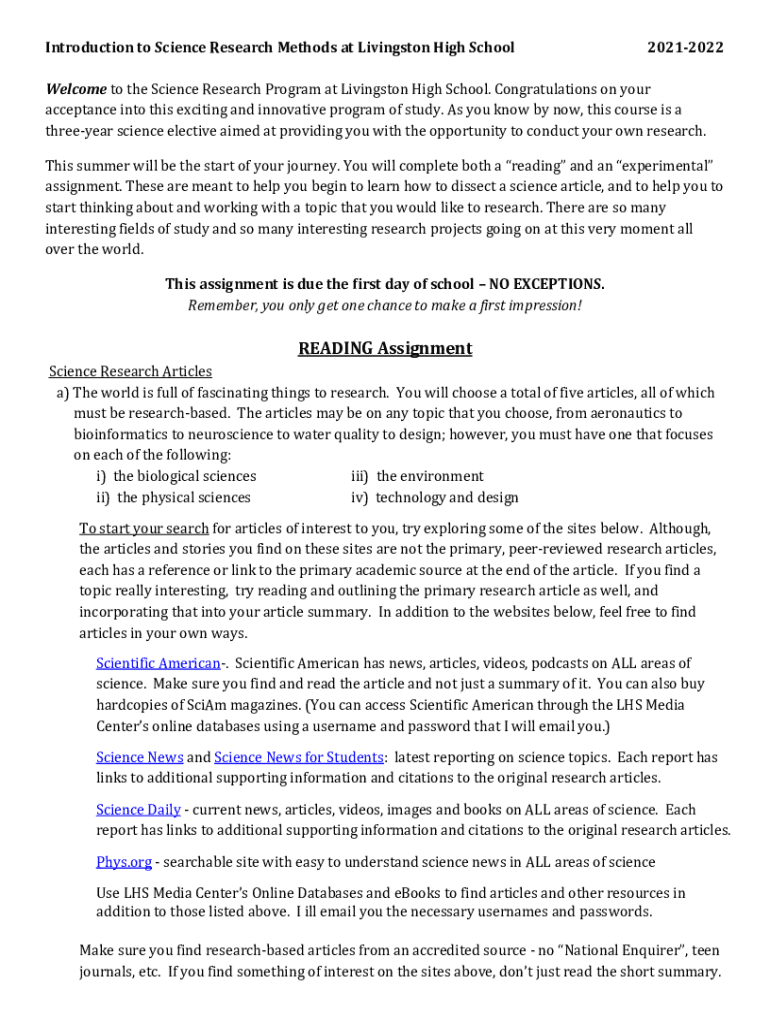 Introduction to Science Research Methods at Livingston High School20212022Welcome to the Science Research Program at Livingston High School. Congratulations on your acceptance into this exciting and
