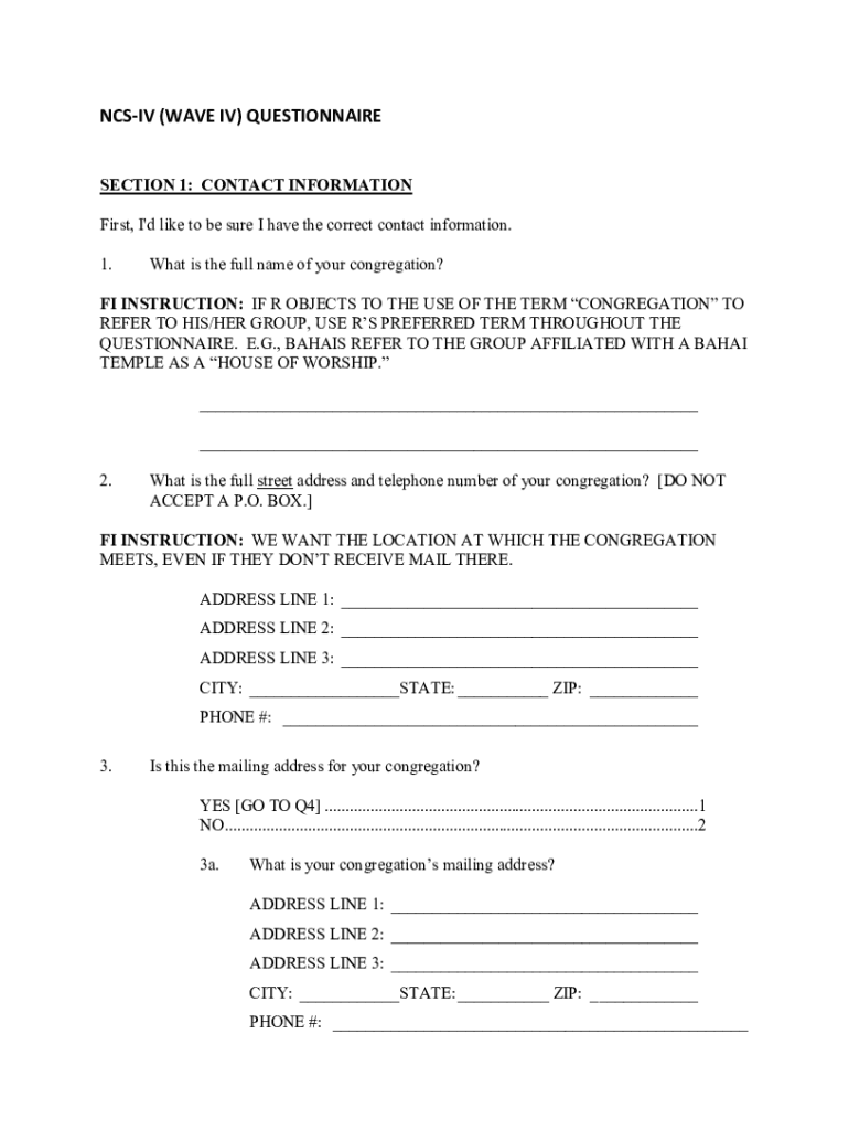 NC SIV (WAVE IV) QUESTIONNAIRE SECTION 1: CONTACT INFORMATION First, I\'d like to be sure I have the correct contact information. 1. What is the full name of your congregation?FI INSTRUCTION: IF R