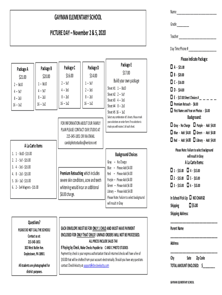 Name ___CAYMAN ELEMENTARY Schoolmate ___PICTURE DAY November 2 & 5, 2020Teacher ___ Day Time Phone # ___Package A $21.00 2 4 8 16 8×10 5×7 2×3 1×2Package B $20.00 1 4 8 16 8×10 5×7 2×3 1×2A