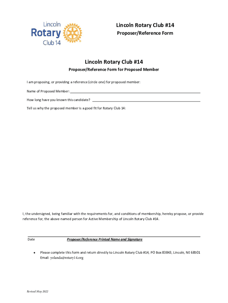Get the free Lincoln Rotary Club #14 - Proposer/Reference Form - NET