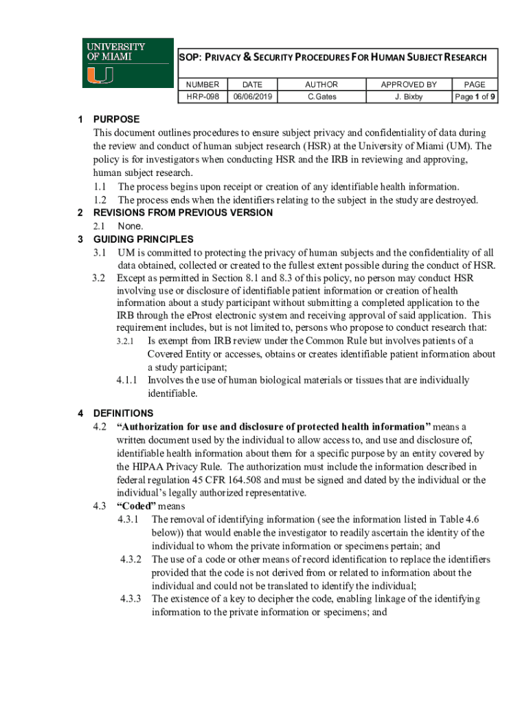 SOP: PRIVACY & SECURITY PROCEDURES FOR HUMAN SUBJECT RESEARCH NUMBERDATEAUTHORAPPROVED BYPAGEHRP09806/06/2019C. Gates. BixbyPage 1 of 91PURPOSE2REVISIONS FROM PREVIOUS VERSION 2.1 None. GUIDING PRINCIPLES3This