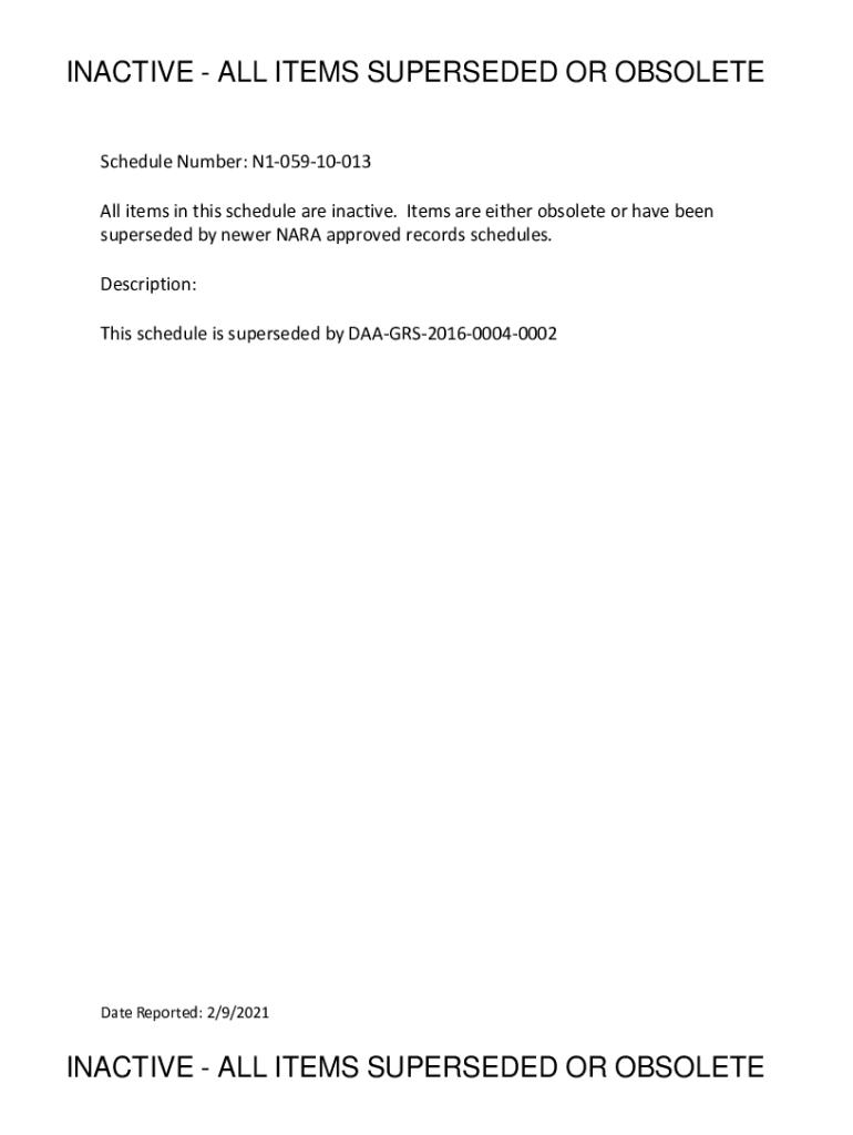 INACTIVE ALL ITEMS SUPERSEDED OR OBSOLETE Schedule Number: N105910013 All items in this schedule are inactive. Items are either obsolete or have been superseded by newer NARA approved records schedules.