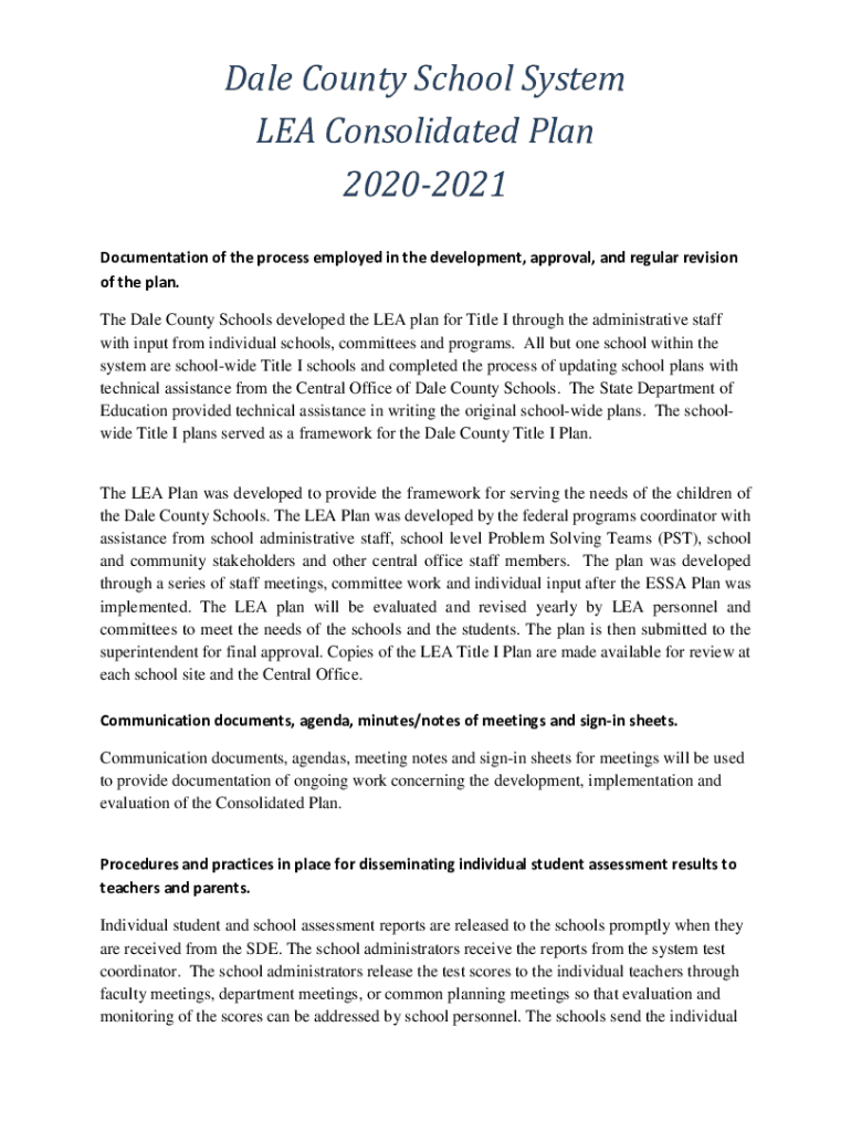 Dale County School System LEA Consolidated Plan 20202021 Documentation of the process employed in the development, approval, and regular revision of the plan. The Dale County Schools developed the