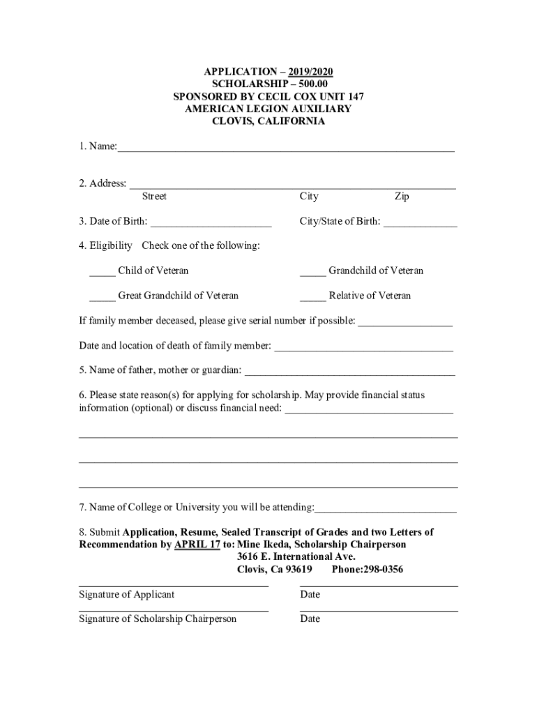 APPLICATION 2019/2020 SCHOLARSHIP 500.00 SPONSORED BY CECIL COX UNIT 147 AMERICAN LEGION AUXILIARY CLOVIS, CALIFORNIA 1. Name:___ 2. Address: ___ Street City Zip 3. Date of Birth: ___City/State of