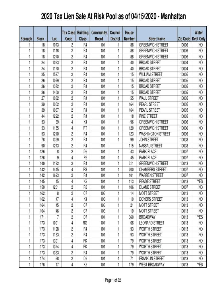 Get the free 2020 Tax Lien Sale At Risk Pool as of 04/15/2020 - Manhattan