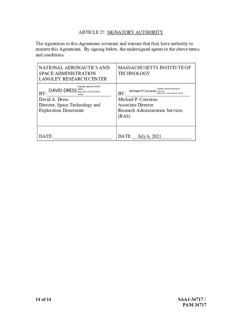REIMBURSABLE SPACE ACT AGREEMENT SAA134717 BETWEEN THE NATIONAL AERONAUTICS AND SPACE ADMINISTRATION LANGLEY RESEARCH CENTER AND MASSACHUSETTS INSTITUTE OF TECHNOLOGY FOR SELECTABLE LUNAR TOWER FOR