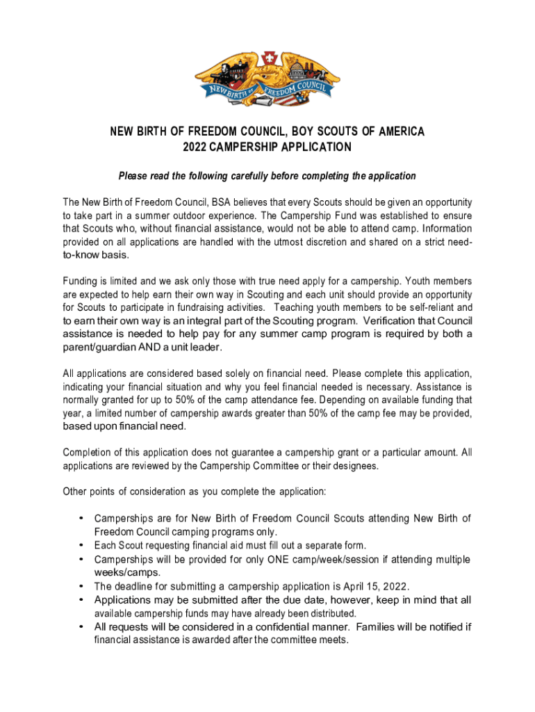 NEW BIRTH OF FREEDOM COUNCIL, BOY SCOUTS OF AMERICA 2022 CAMPERS HIP APPLICATION Please read the following carefully before completing the application The New Birth of Freedom Council, BSA believes