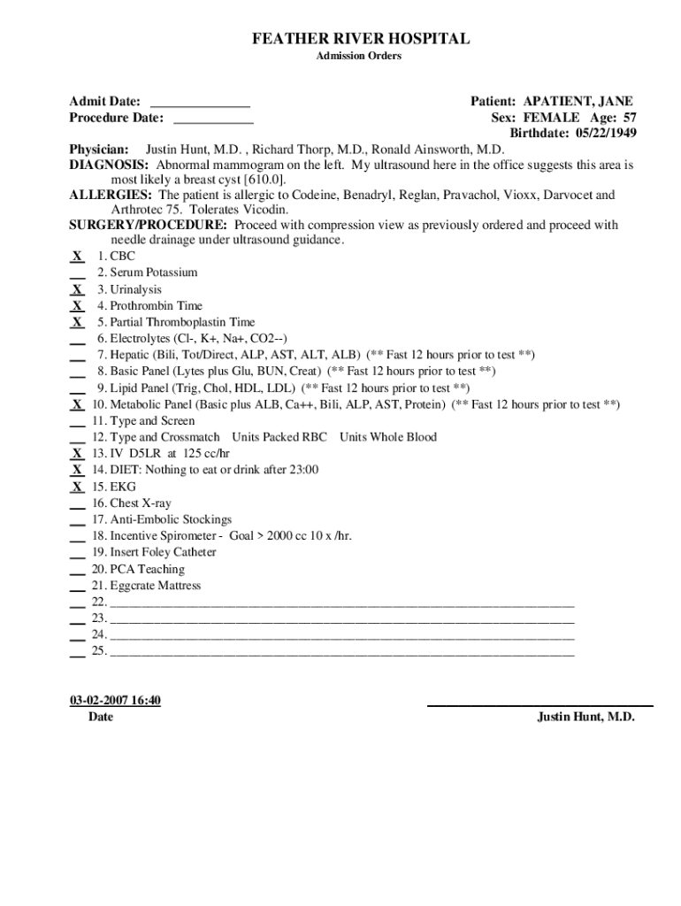 FEATHER RIVER HOSPITAL Admission OrdersAdmit Date: ___ Procedure Date: ___Patient: PATIENT, JANE Sex: FEMALE Age: 57 Birthdate: 05/22/1949 Physician: Justin Hunt, M.D., Richard Thor, M.D., Ronald