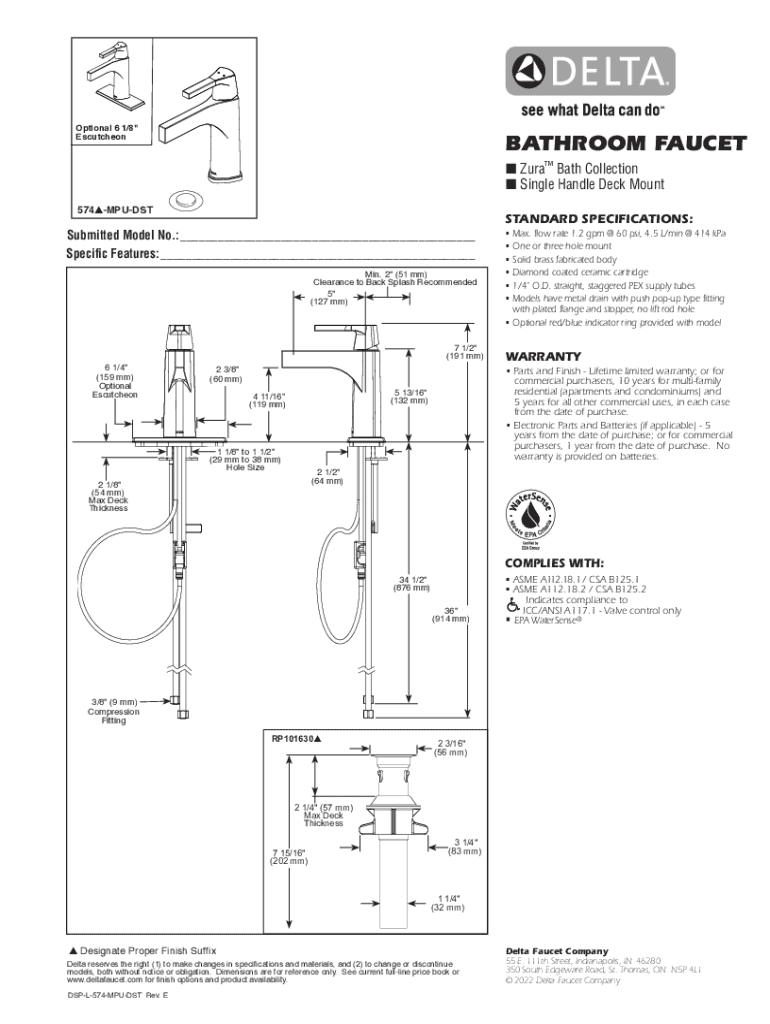 Optional 6 1/8\” EscutcheonBATHROOM FAUCET Aura Bath Collection Single Handle Deck Mount574MPUDSTSTANDARD SPECIFICATIONS:Submitted Model No.:___ Specific Features:___ Min. 2\” (51 mm) Clearance