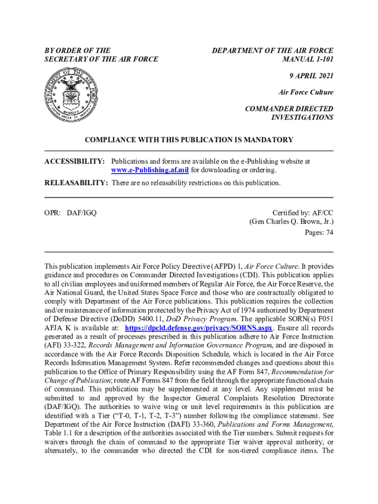BY ORDER OF THE SECRETARY OF THE AIR FORCEDEPARTMENT OF THE AIR FORCE MANUAL 1101 9 APRIL 2021 Air Force Culture COMMANDER DIRECTED INVESTIGATIONSCOMPLIANCE WITH THIS PUBLICATION IS MANDATORY ACCESSIBILITY: