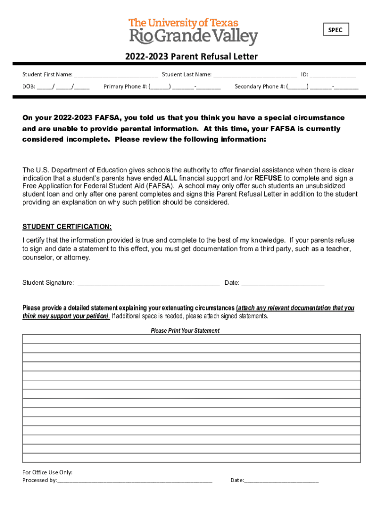 SPEC20222023 Parent Refusal Letter Student First Name: ___ Student Last Name: ___ ID: ___ DOB: ___/ ___/___Primary Phone #: (___) ______Secondary Phone #: (___) ______On your 20222023 FAFSA, you told