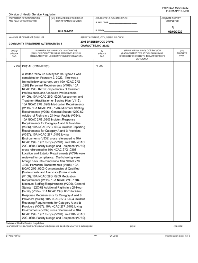 PRINTED: 02/04/2022 FORM APPROVEDDivision of Health Service Regulation STATEMENT OF DEFICIENCIES AND PLAN OF CORRECTION(X1) PROVIDER/SUPPLIER/CIA IDENTIFICATION NUMBER:COMMUNITY TREATMENT ALTERNATIVES