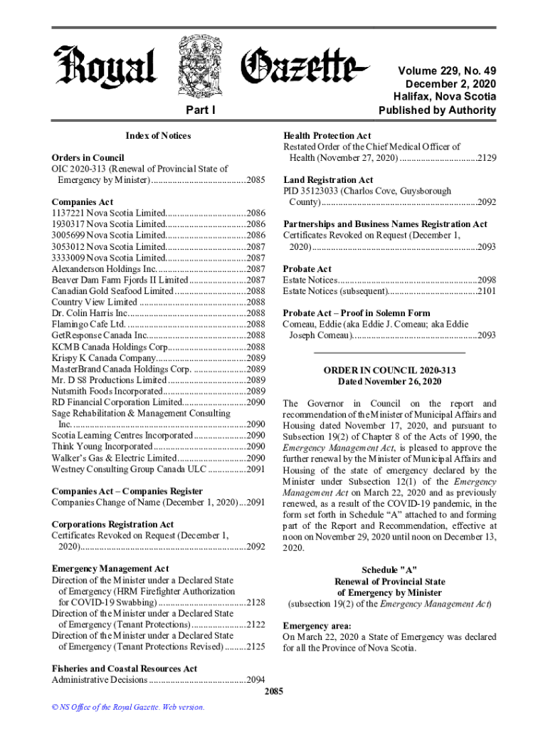 Get the free NS Royal Gazette Part I - Volume 229, No. 49 - December 2, 2020. Publication of the ...