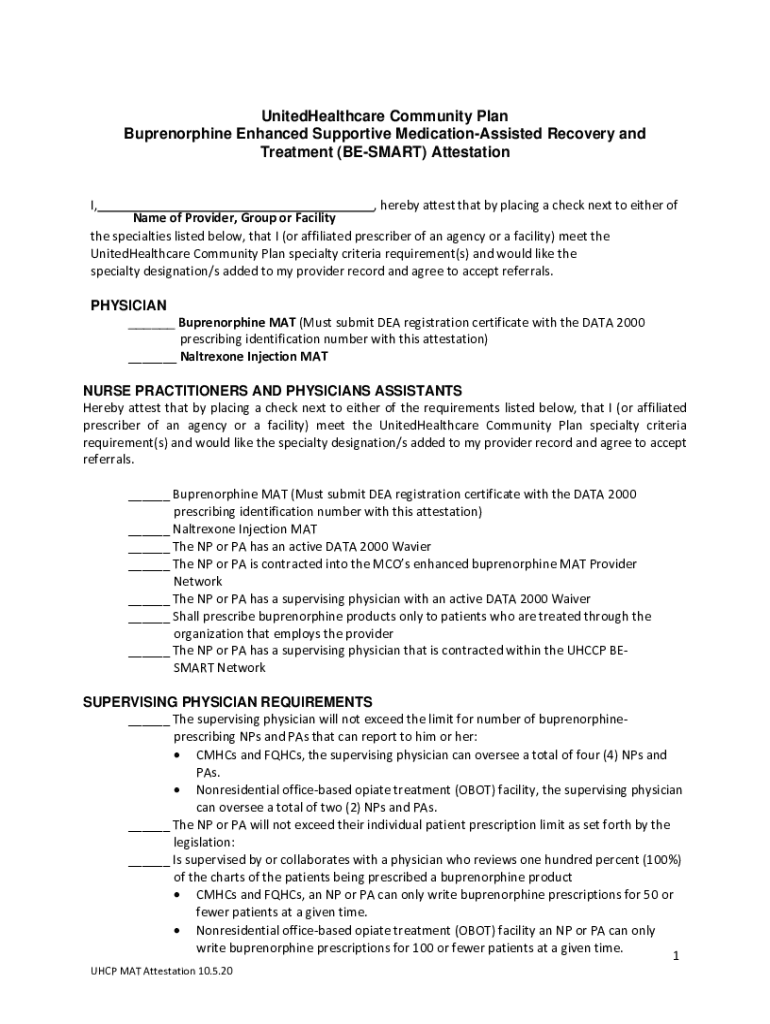 UnitedHealthcare Community Plan Enhanced Supportive MedicationAssisted Recovery and Treatment (BE SMART) Attestation I, hereby attest that by placing a check next to either of Name of Provider, Group
