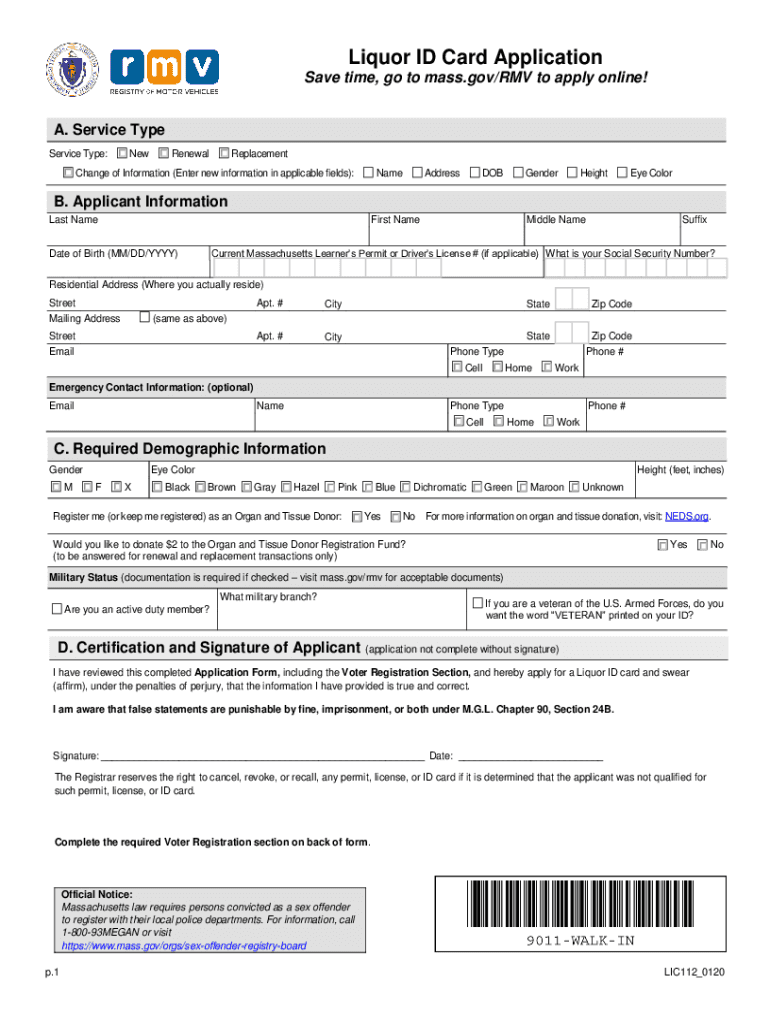 Liquor ID Card Application Save time, go to mass.gov/RMV to apply online! A. Service Type: New Renewal Replacement Change of Information (Enter new information in applicable fields): Name Address
