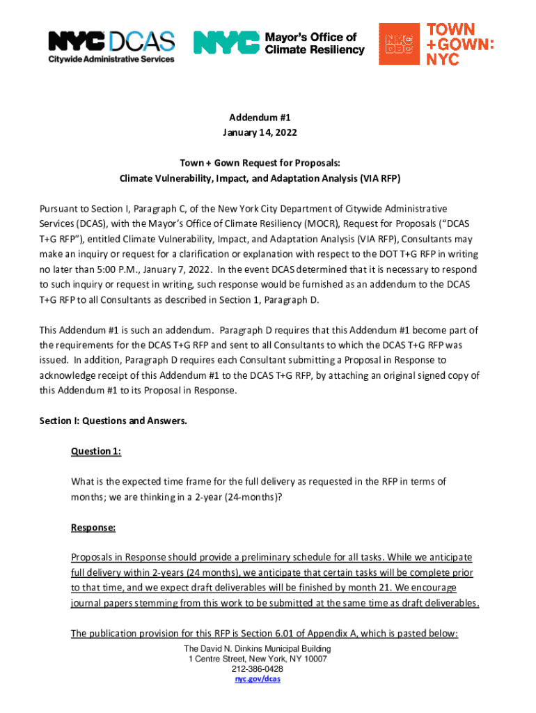 Addendum #1 January 14, 2022, Town + Gown Request for Proposals: Climate Vulnerability, Impact, and Adaptation Analysis (VIA RFP) Pursuant to Section I, Paragraph C, of the New York City Department