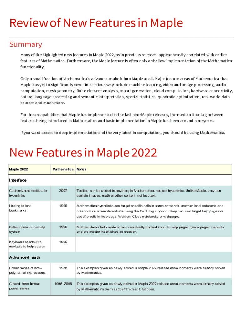 Review of New Features in Maple Summary Many of the highlighted new features in Maple 2022, as in previous releases, appear heavily correlated with earlier features of Mathematical. Furthermore, the