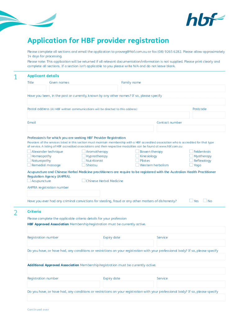 Application for HBO provider registration Please complete all sections and email the application to provreg@hbf.com.au or fax (08) 9265 6282. Please allow approximately 14 days for processing. Please