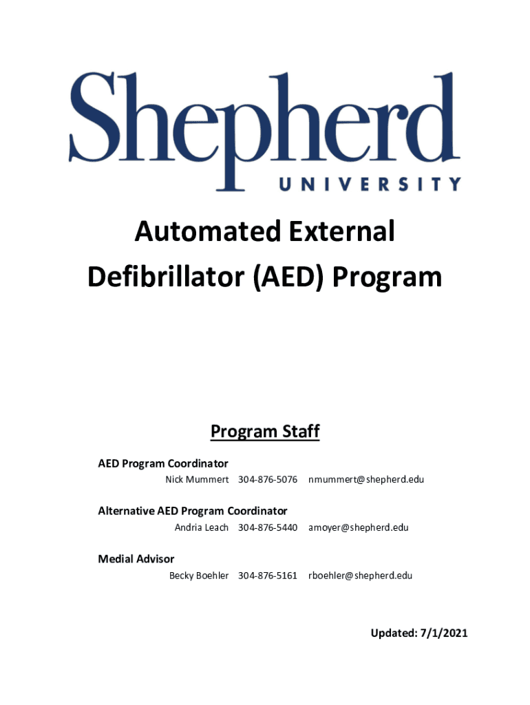 Automated External Defibrillator (AED) ProgramProgram Staff AED Program Coordinator Nick Mummers 3048765076nmummert@shepherd.eduAlternative AED Program Coordinator Andrea Leach 3048765440amoyer@shepherd.eduBecky