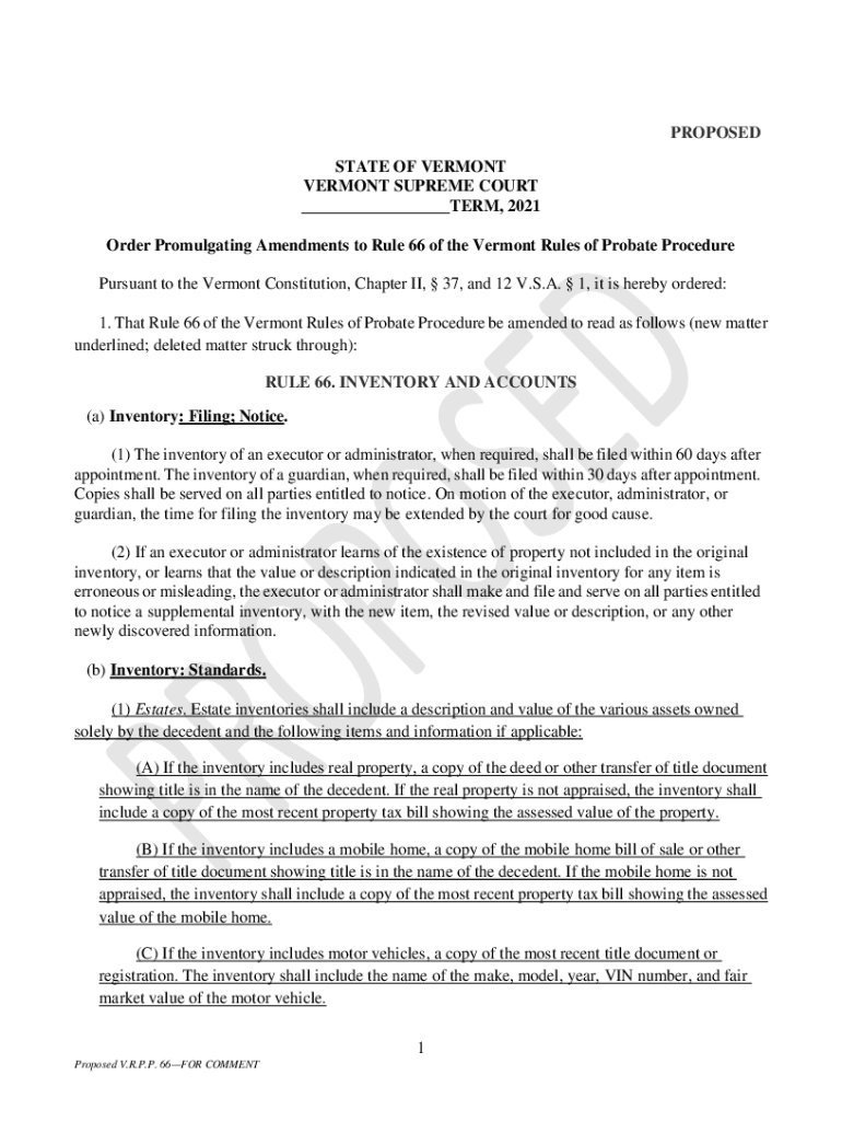 PROPOSED STATE OF VERMONT SUPREME COURT ___TERM, 2021 Order Promulgating Amendments to Rule 66 of the Vermont Rules of Probate Procedure Pursuant to the Vermont Constitution, Chapter II, 37, and 12