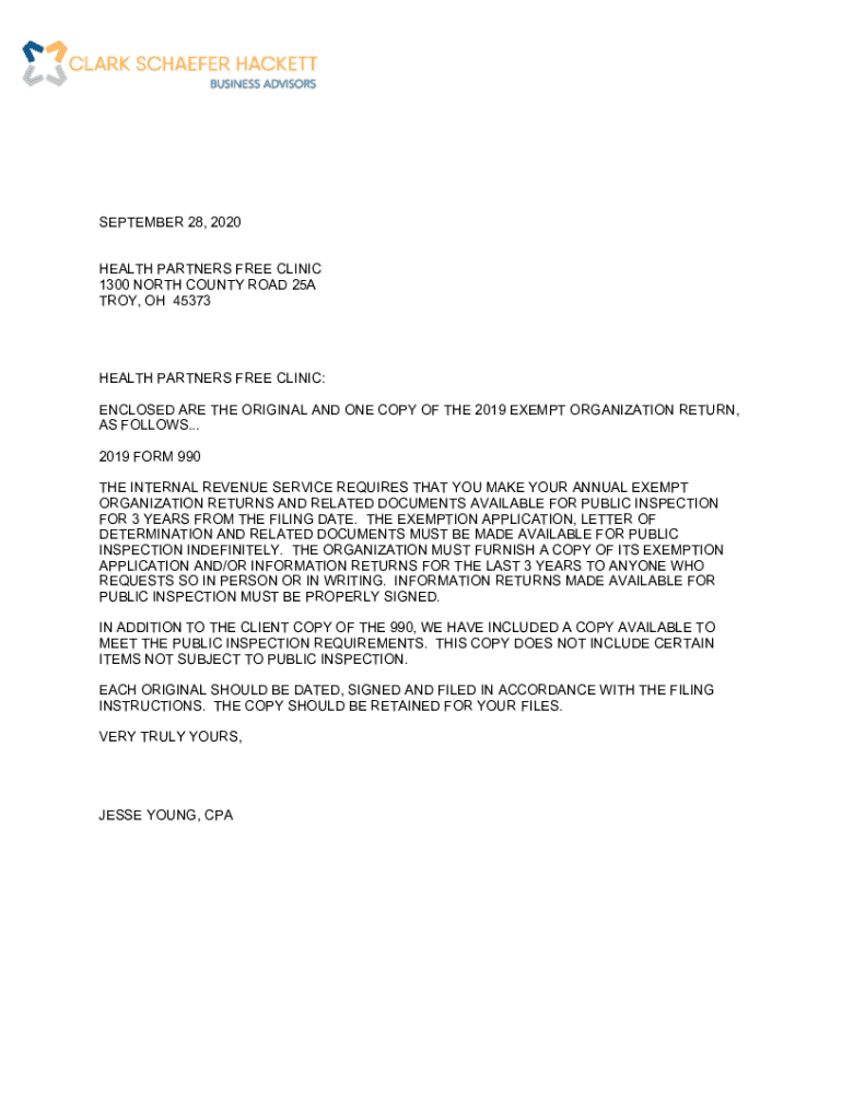 SEPTEMBER 28, 2020, HEALTH PARTNERS FREE CLINIC 1300 NORTH COUNTY ROAD 25A TROY, OH 45373HEALTH PARTNERS FREE CLINIC: ENCLOSED ARE THE ORIGINAL AND ONE COPY OF THE 2019 EXEMPT ORGANIZATION RETURN,