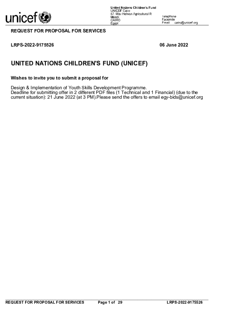 United Nations Children\'s Fund UNICEF Cairo 87, Miss Helen Agricultural R Telephone Mahdi Facsimile CAIRO Email cairo@unicef.org ___ EgyptREQUEST FOR PROPOSAL FOR SERVICES LRPS2022917552606 June