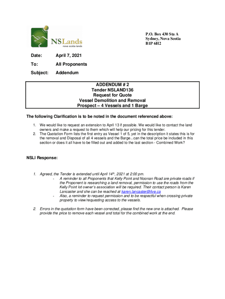 P.O. Box 430 Sta A Sydney, Nova Scotia B1P 6H2Date:April 7, 2021To:All ProponentsSubject:Addendum # 2 Tender NSLAND136 Request for Quote Vessel Demolition and Removal Prospect 4 Vessels and 1 Barrette