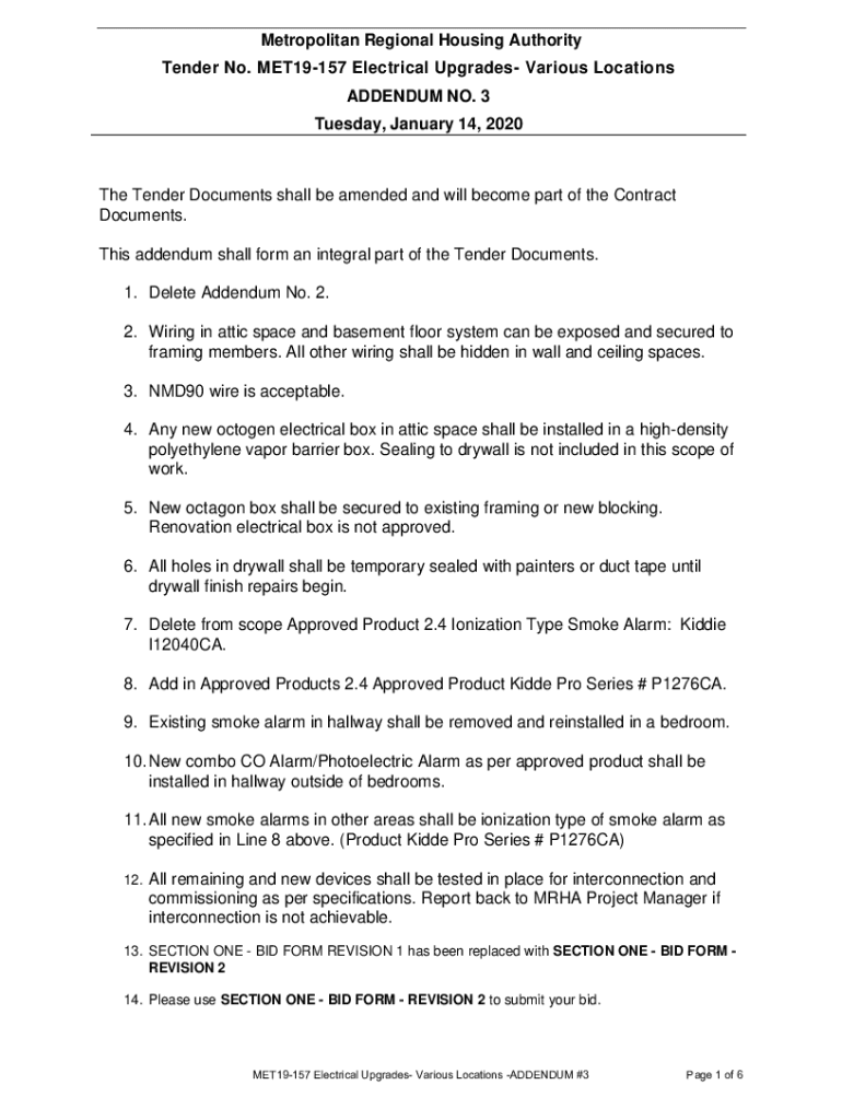 Metropolitan Regional Housing Authority Tender No. MET19157 Electrical Upgrades Various Locations ADDENDUM NO. 3 Tuesday, January 14, 2020The Tender Documents shall be amended and will become part