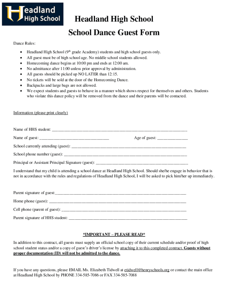 Headland High School Dance Guest Form Dance Rules: Headland High School (9th grade Academy) students and high school guests only. All guest must be of high school age. No middle school students allowed.