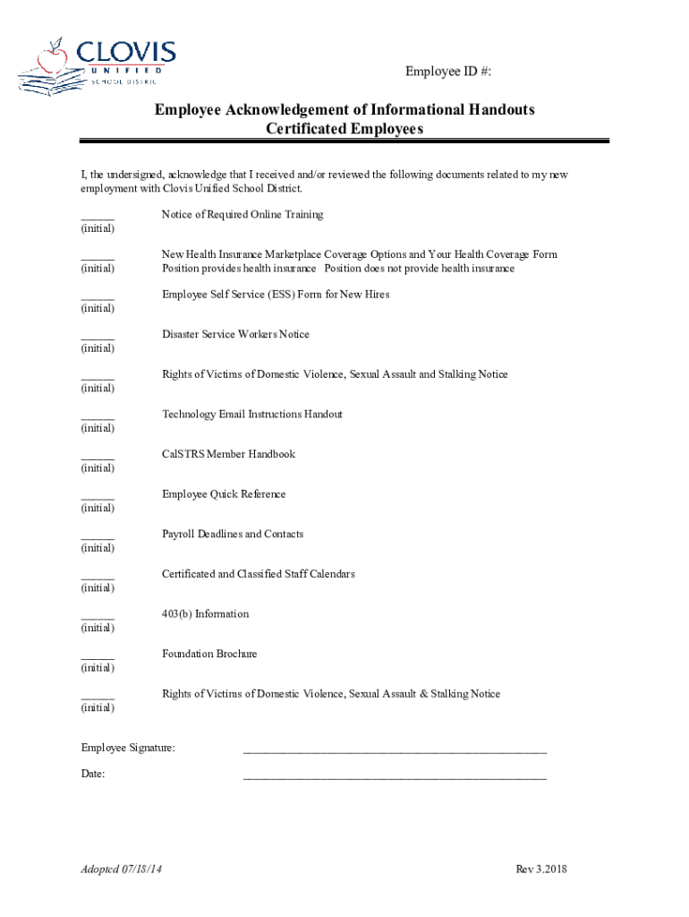Employee ID #:Employee Acknowledgement of Informational Handouts Certificated Employees I, the undersigned, acknowledge that I received and/or reviewed the following documents related to my new employment