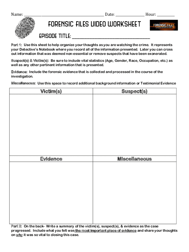 Name: ___ Date: ___ Hour: ___Forensic Files Video Worksheet Episode Title: ___ Part 1: Use this sheet to help organize your thoughts as you are watching the crime. It represents your Detectives Notebook