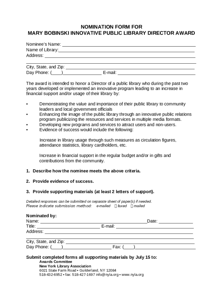 - Find the NOMINATION FOR MARY BOBINSKI INNOVATIVE PUBLIC LIBRARY DIRECTOR AWARD form in PDFfiller’s library.