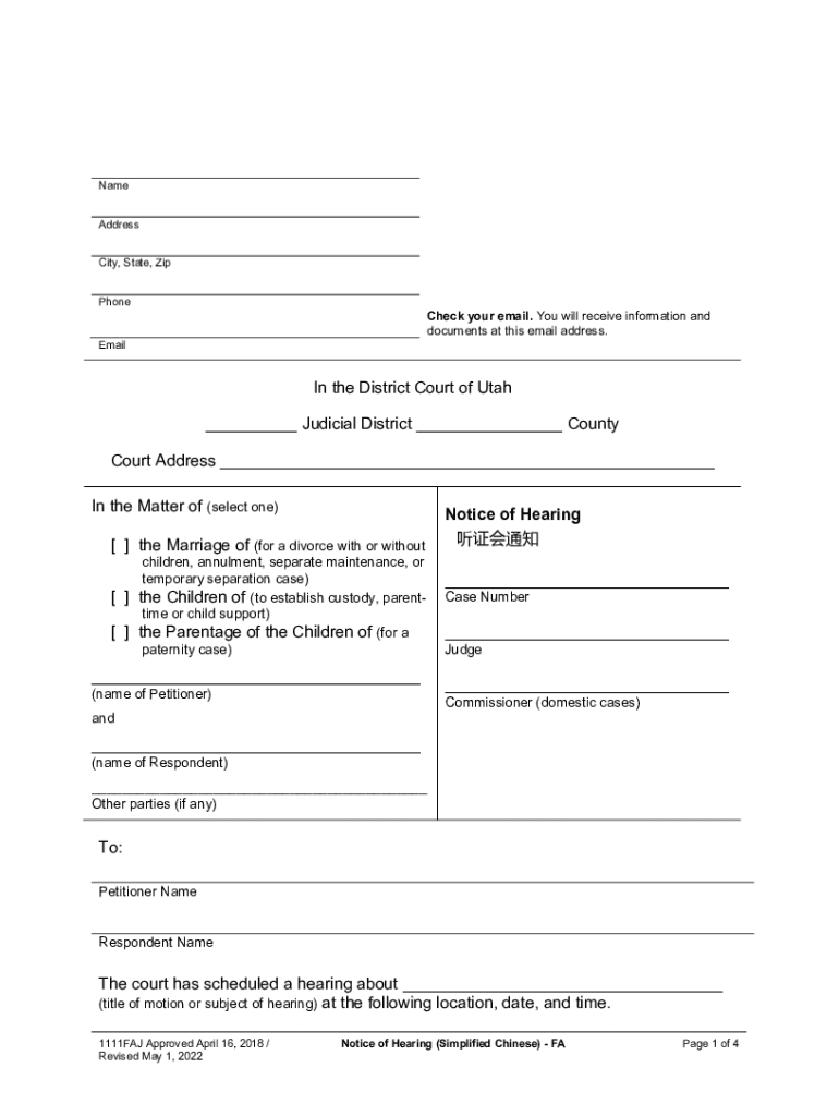 Name Address City, State, Zip Precheck your email. You will receive information and documents at this email address. Emailing the District Court of Utah ___ Judicial District ___ County Court Address