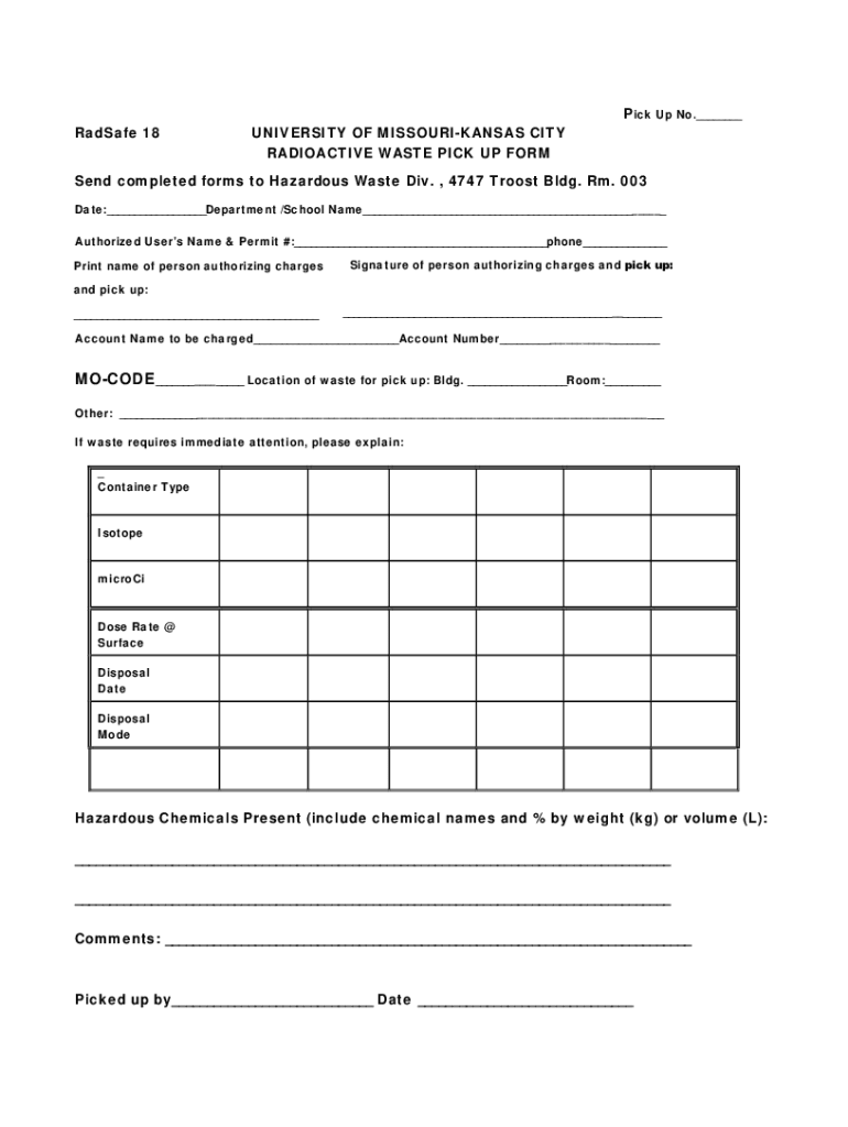 Pick Up No.___ Radiate 18UNIVERSITY OF MISSOURIANS CITY RADIOACTIVE WASTE PICK UP FORMS end completed forms to Hazardous Waste Div. , 4747 Roost Bldg. Rm. 003 Date:___Department /School Name___ Authorized