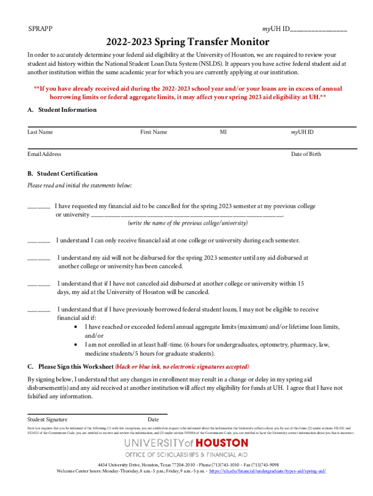 SPRAPPmyUH ID___20222023 Spring Transfer Monitoring order to accurately determine your federal aid eligibility at the University of Houston, we are required to review your student aid history within