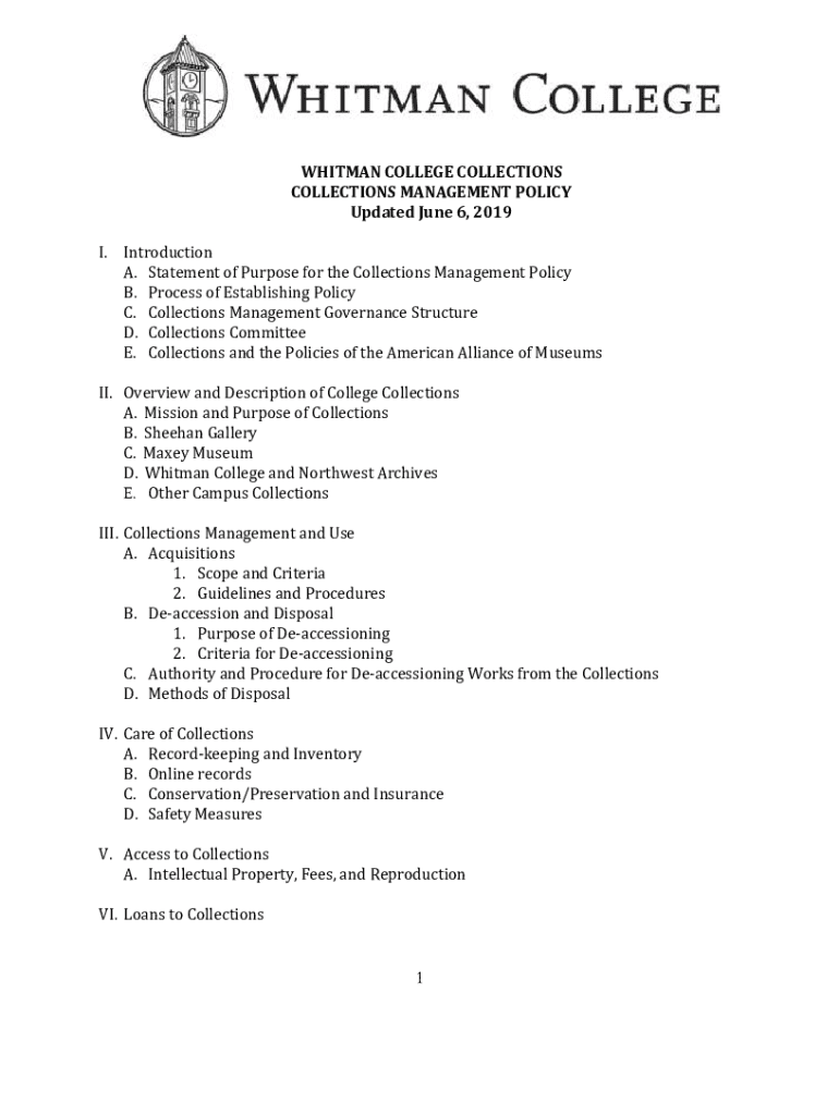 WHITMAN COLLEGE COLLECTIONS MANAGEMENT POLICY Updated June 6, 2019, I. Introduction A. Statement of Purpose for the Collections Management Policy B. Process of Establishing Policy C. Collections Management