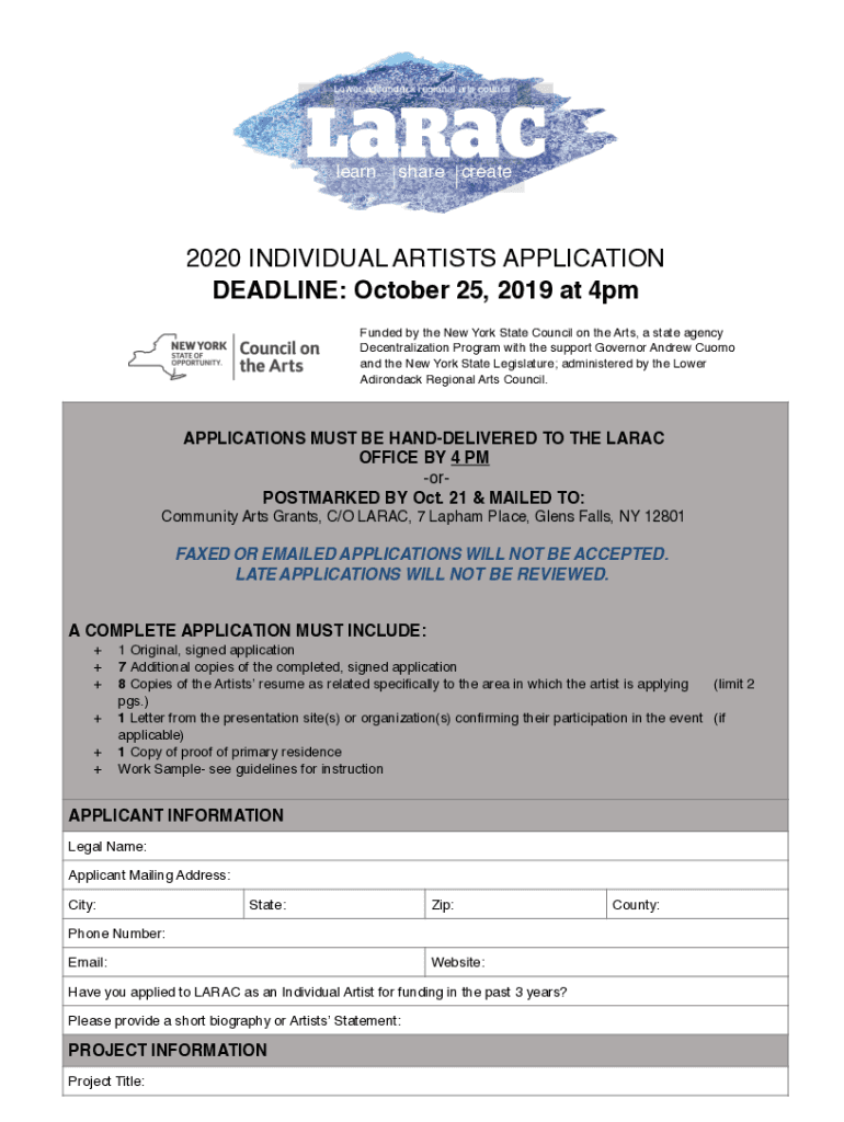 Lower Adirondack regional arts councillearnshare create2020 INDIVIDUAL ARTISTS APPLICATION
