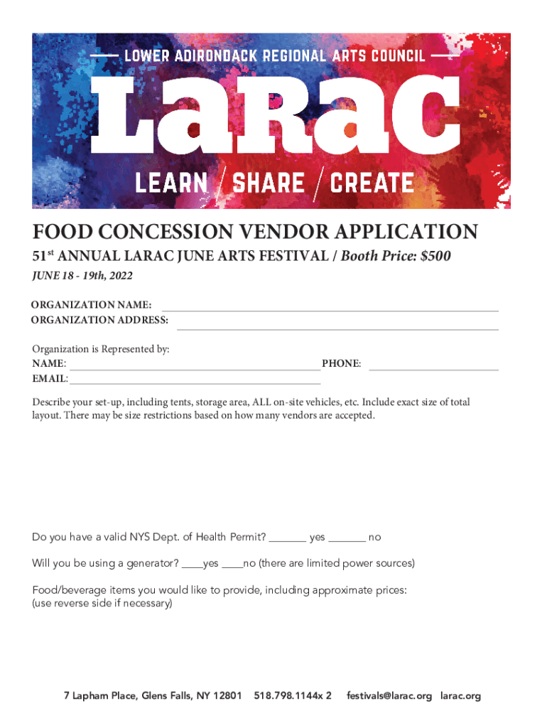 FOOD CONCESSION VENDOR APPLICATION51st ANNUAL LARA JUNE ARTS FESTIVAL / Booth Price: $500 JUNE 18 19th, 2022 ORGANIZATION NAME: ORGANIZATION ADDRESS: Organization is Represented by: NAME: EMAIL:PHONE:Describe
