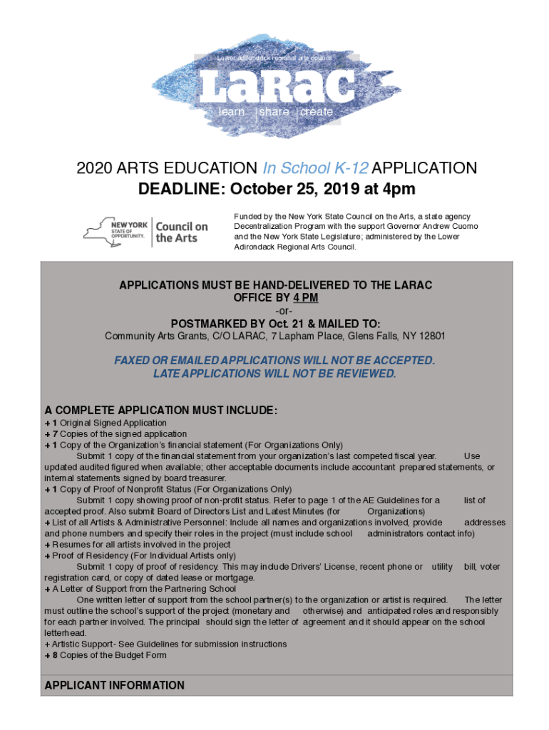 Lower Adirondack regional arts councillearnshare create2020 ARTS EDUCATION In School K12 APPLICATION DEADLINE: October 25, 2019, at 4pm Funded by the New York State Council on the Arts, a state agency