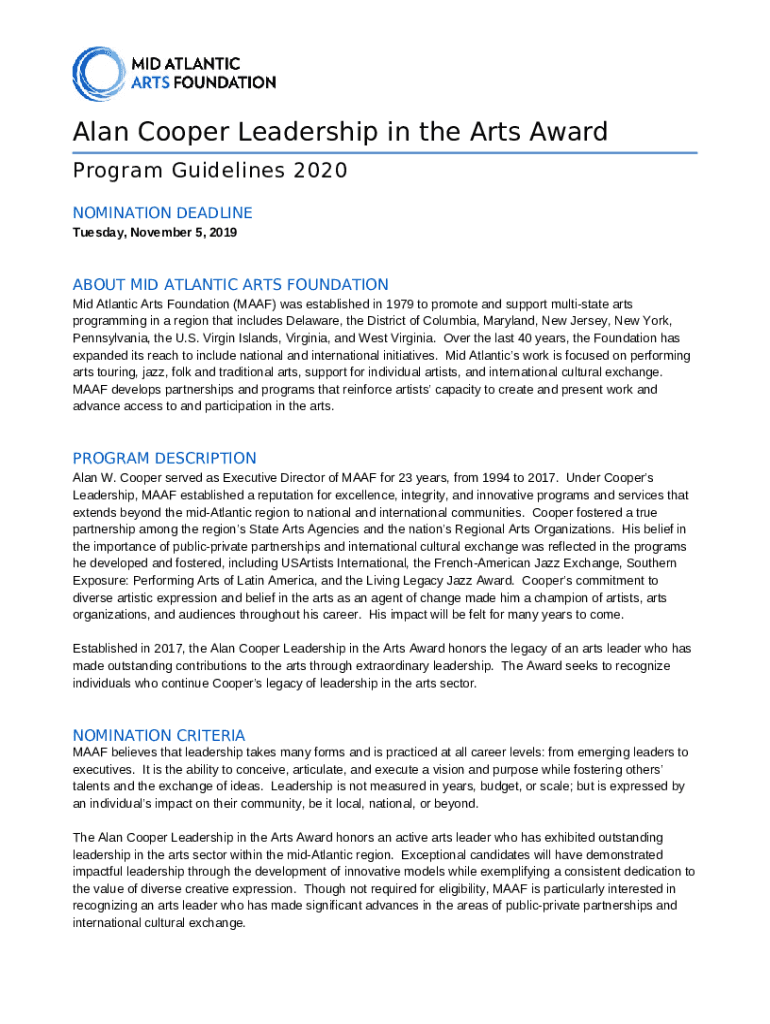 Instructions for the NOMINATION DEADLINE - Mid Atlantic Arts Foundation form