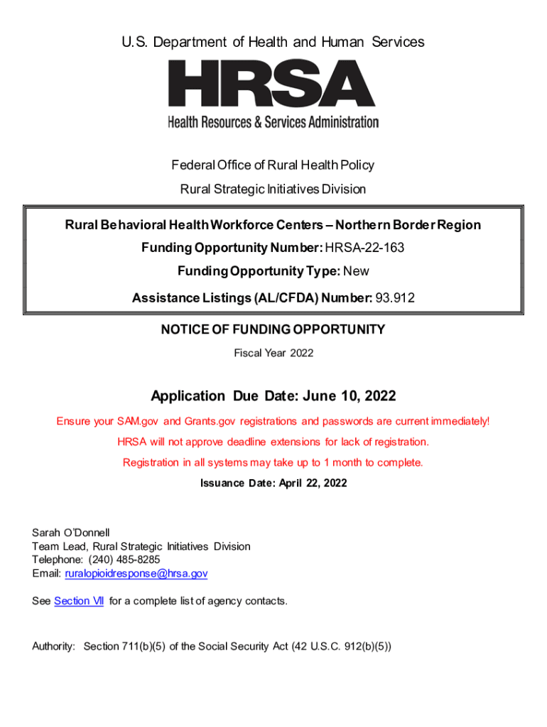 U.S. Department of Health and Human Services Federal Office of Rural Health Policy Rural Strategic Initiatives Division Rural Behavioral Health Workforce Centers Northern Border Region Funding Opportunity