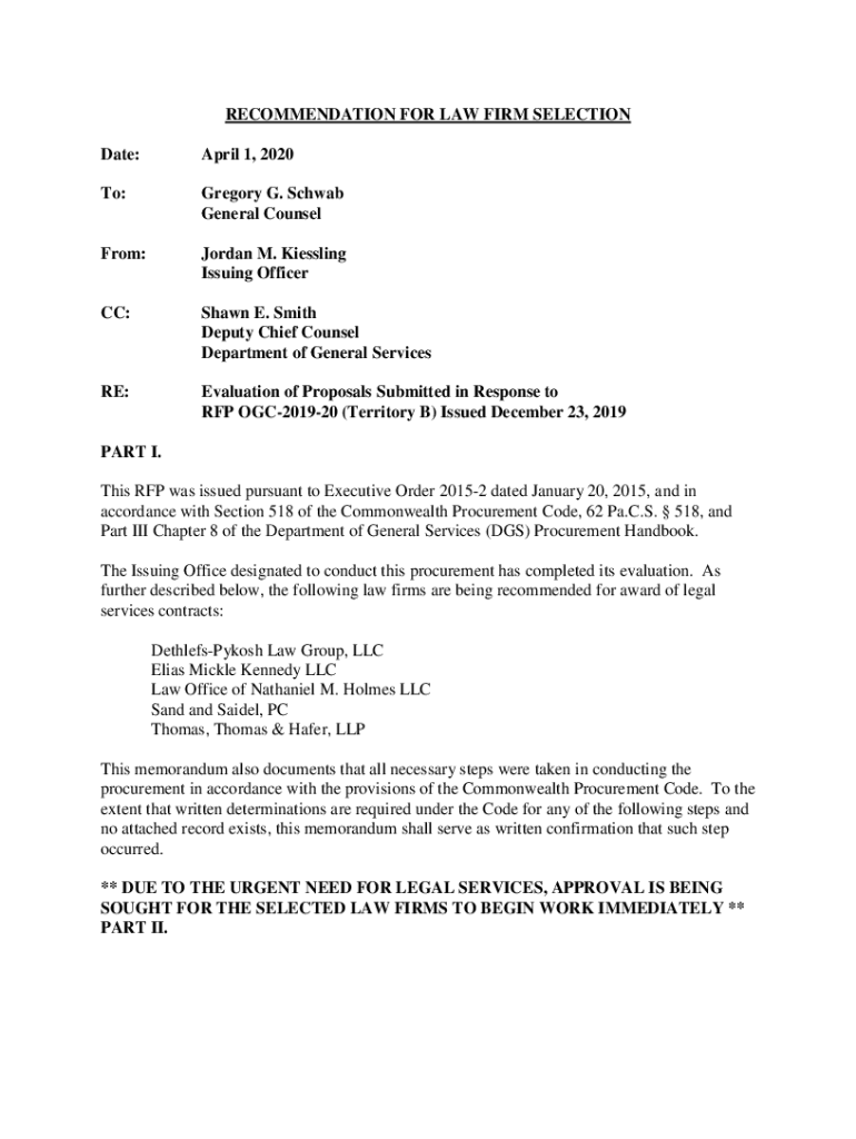 RECOMMENDATION FOR LAW FIRM SELECTION Date:April 1, 2020To:Gregory G. Schwab General Counselor:Jordan M. Kissing Issuing Officer CC:Shawn E. Smith Deputy Chief Counsel Department of General Services