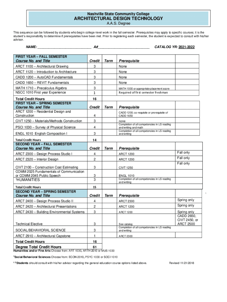 Nashville State Community CollegeARCHITECTURAL DESIGN TECHNOLOGY A.A.S. Degree This sequence can be followed by students who begin college level work in the fall semester. Prerequisites may apply